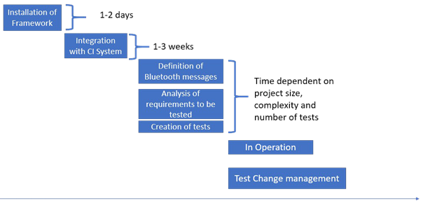 Der Implementierungsprozess mit der Installation des Frameworks, der Integration mit dem CI-System, der Definition der Test Cases und der Implementierung im produktiven Umfeld ist im folgenden Bild aufgeführt: